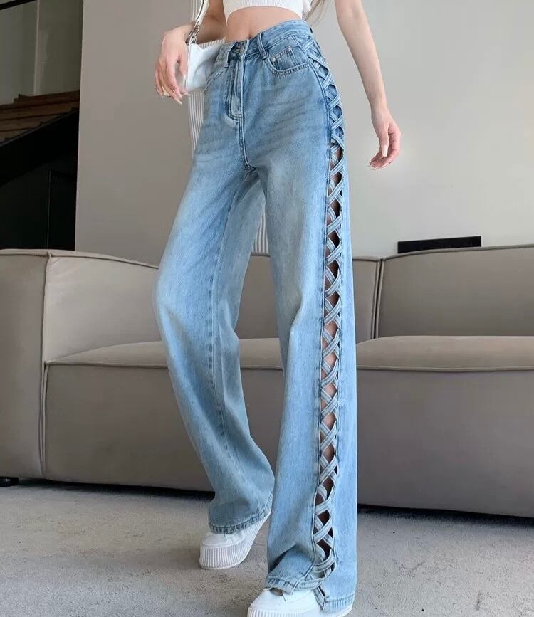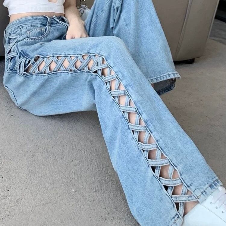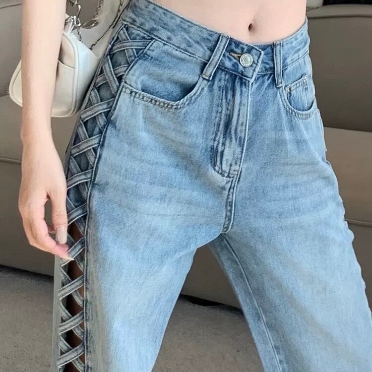 両サイドがレースアップデザインのストレートデニム。ヘルシーな肌見せがポイント◎