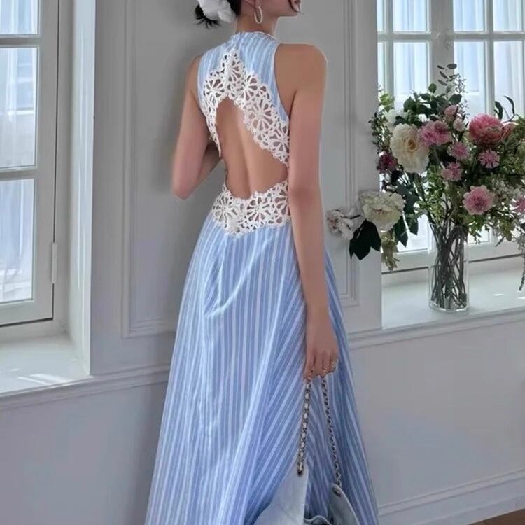 Ladies / 肌見せ 背中見せ 涼感 ストライプ Aラインワンピース ⭐︎+°100