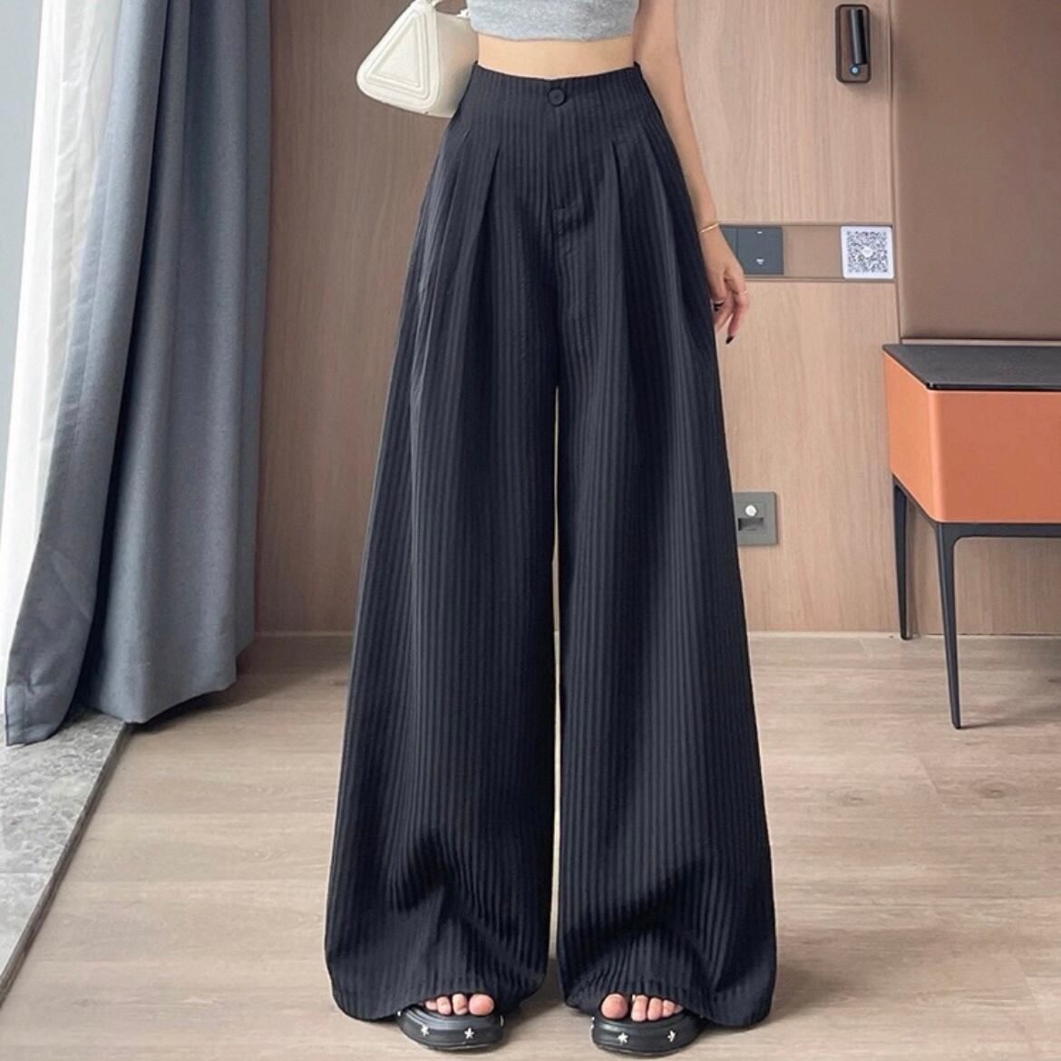 さらさらでひんやり接触冷感素材のストライプパンツ。極太のワイドパンツで華奢見せ効果も抜群!