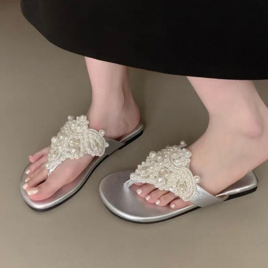 フロントのパールビジューが華やかながらラフな印象のフラットサンダル。楽ちんなのにきちんと感たっぷり♡