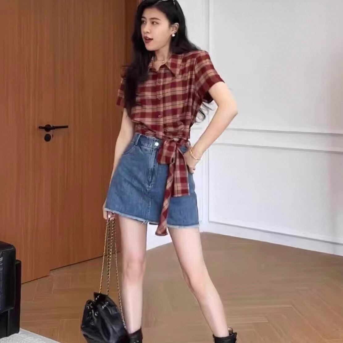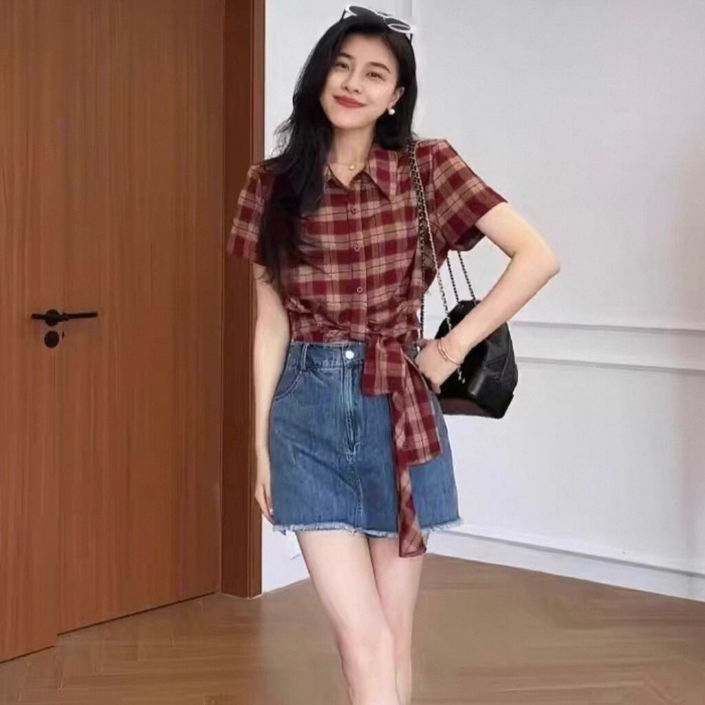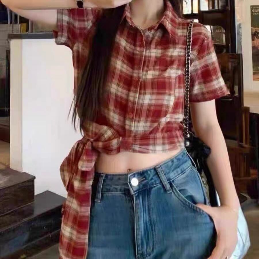 夏はもちろん秋口にかけても長く着用できるショート丈ネルシャツトップス。裾を結んで着用するデザイン♡