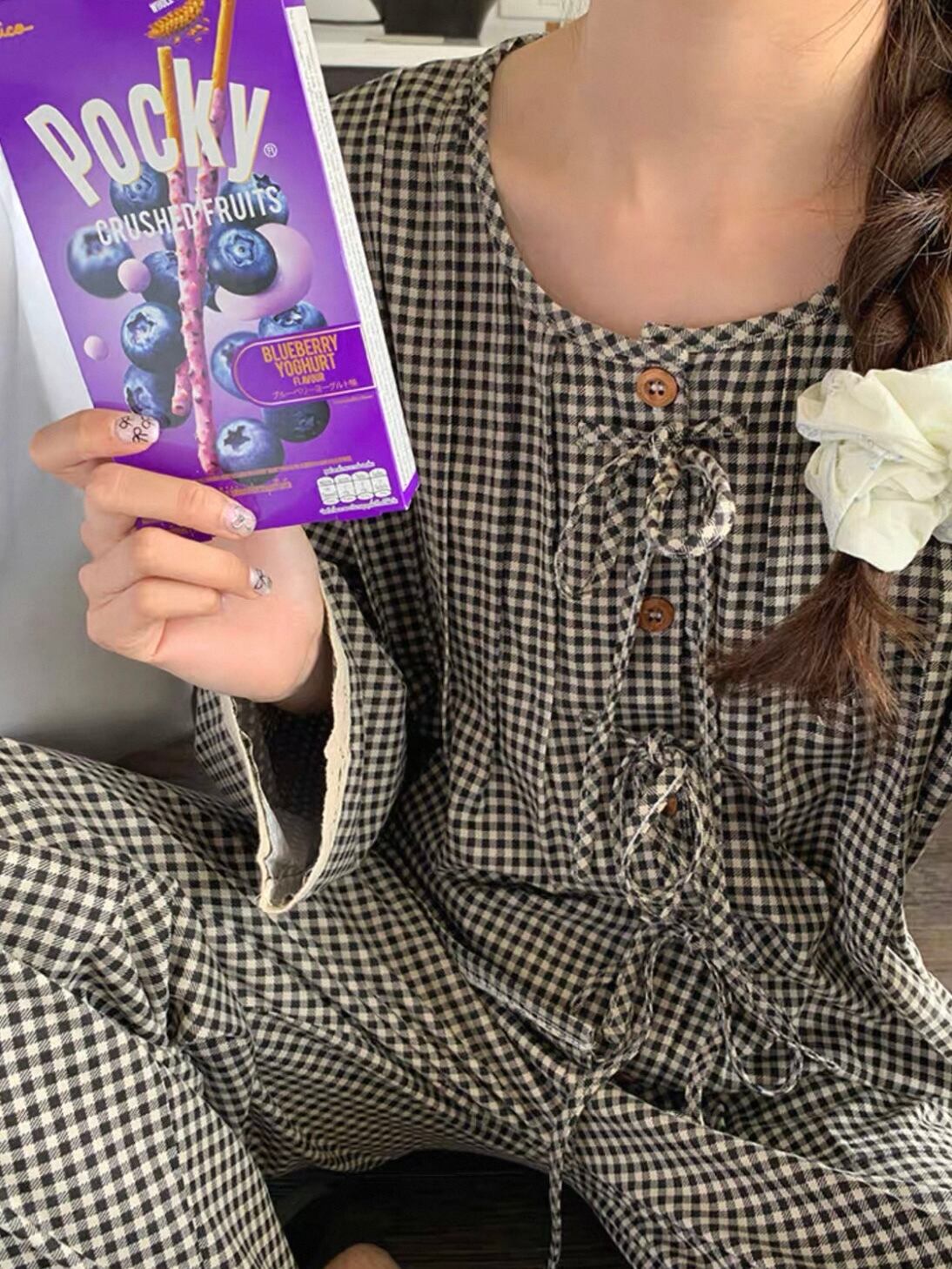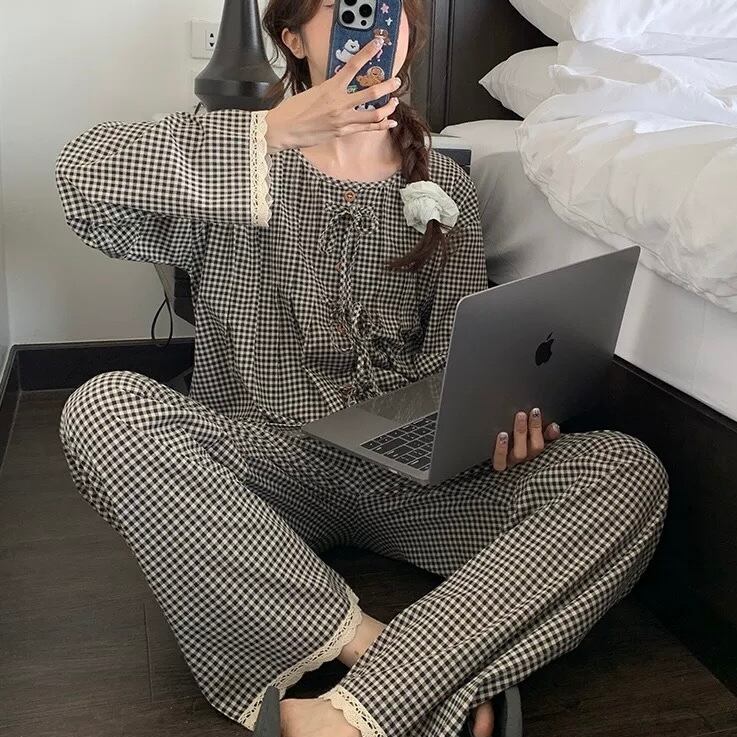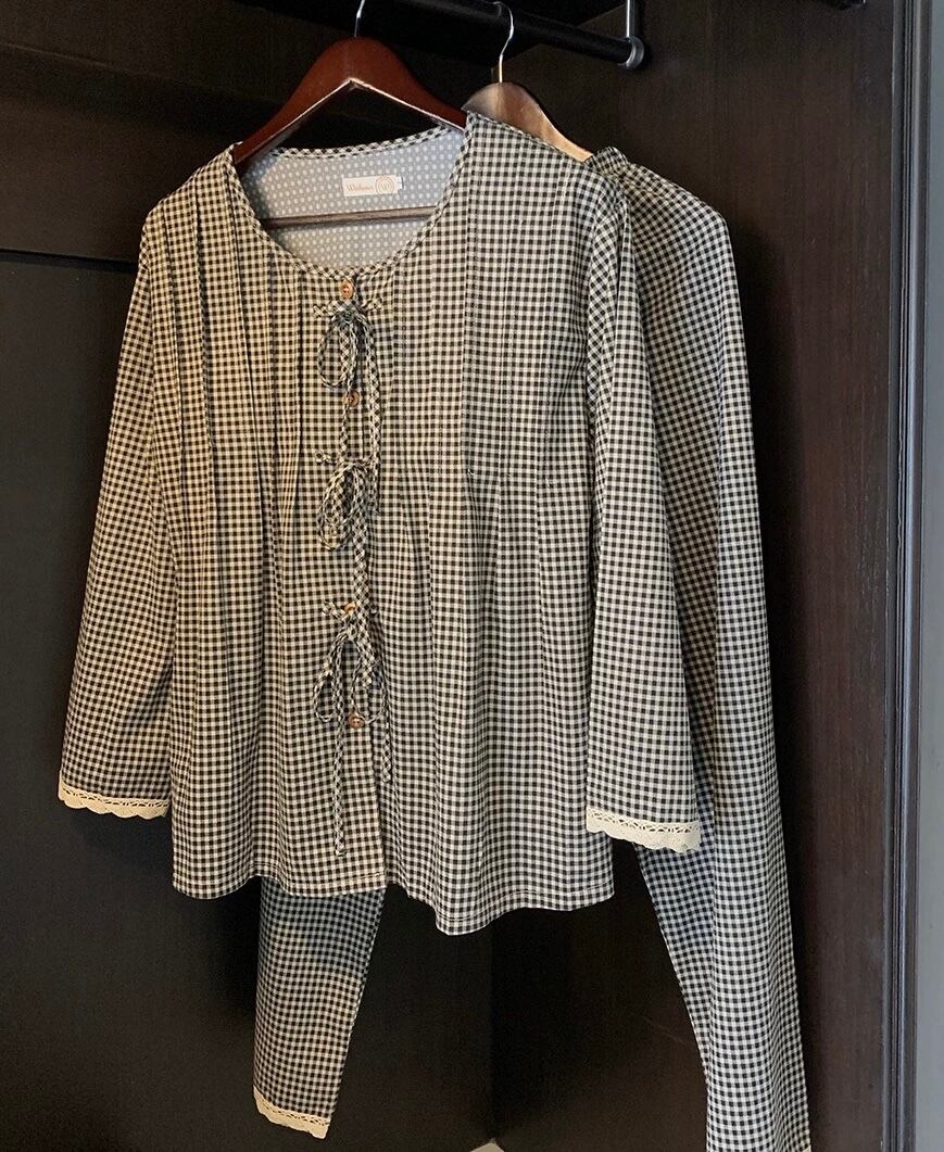 通気性のいいコットンと冷え防止に有効な長袖長ズボンのルームウェア。ギンガムチェックとリボン、袖と裾のコットンフリルも可愛いデザインでおうち時間も可愛く♡