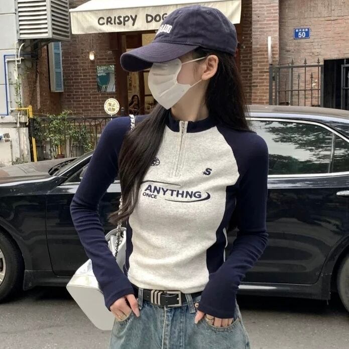 ハーフジップデザインだから1枚でしっかり決まるロングTシャツ。スポーティな刺繍デザインが高見えポイント♡