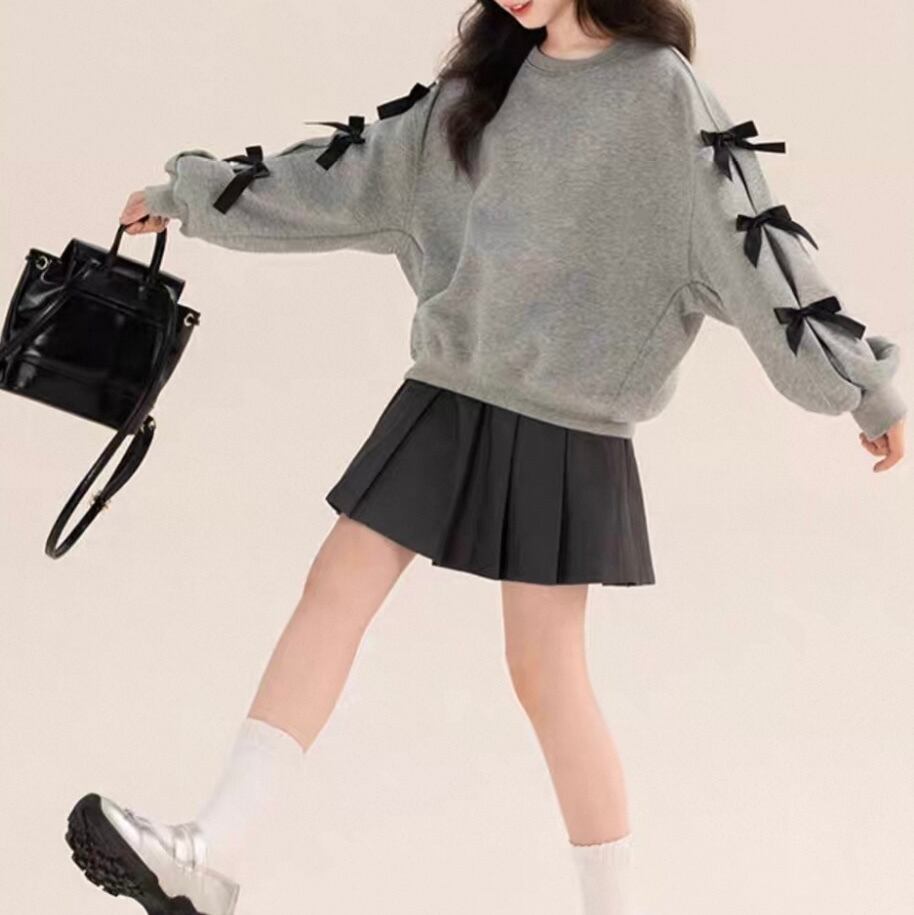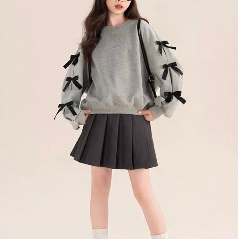 袖にリボンがあしらわれたシンプルなトレーナー。