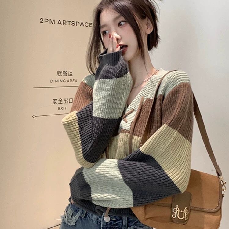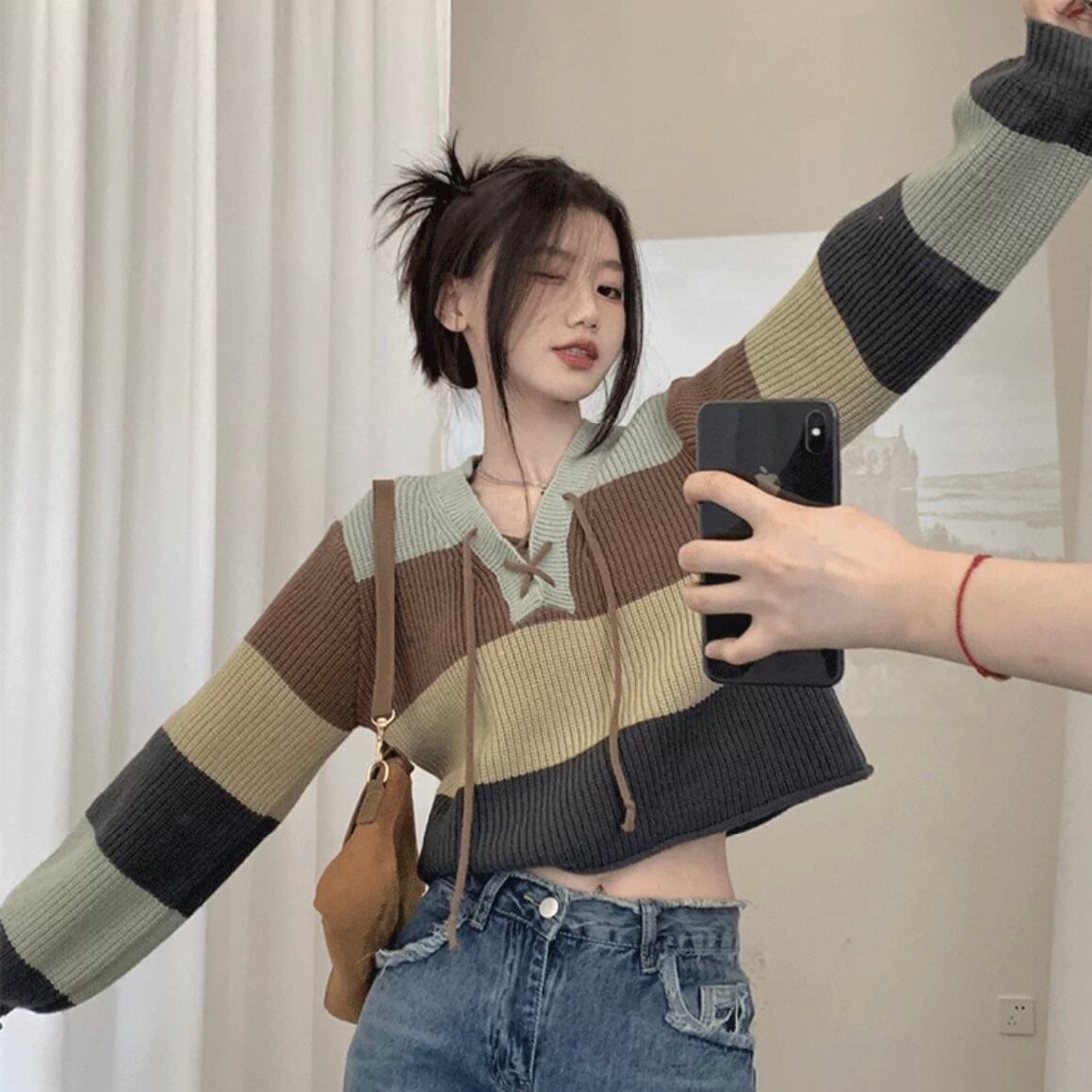 [秋冬♡][レースアップ♡] Ladies / S〜XL展開 / 秋色 ボーダー レースアップネック ショート丈 ニット ⭐︎+°238