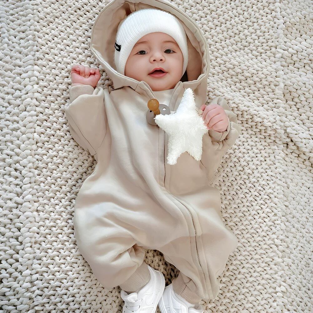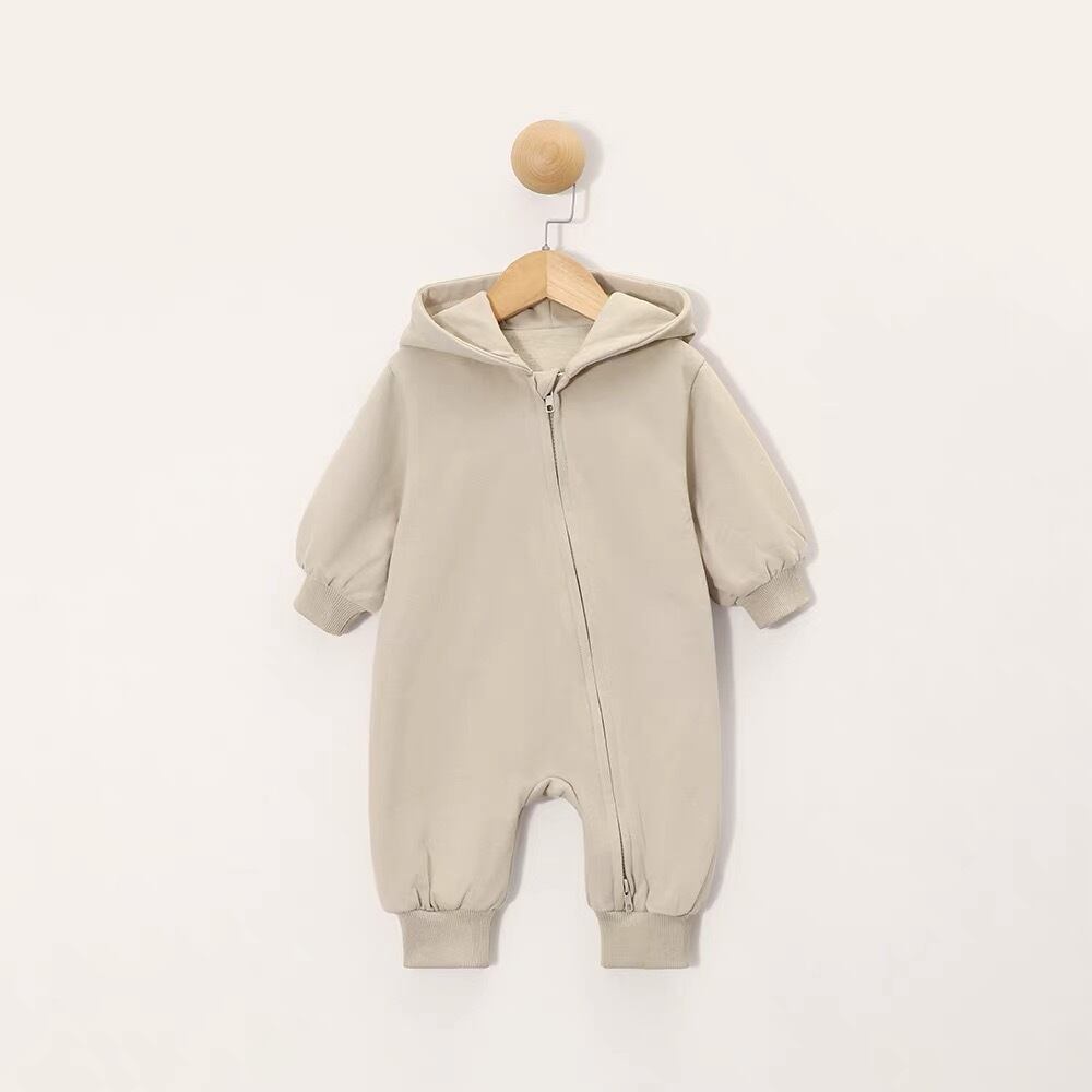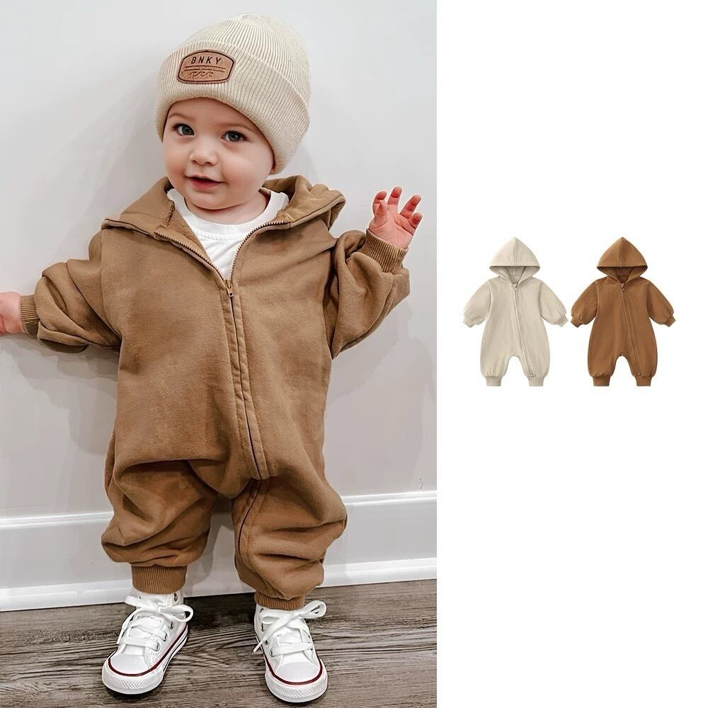 生後間もない赤ちゃんからよちよち歩きベビーまで、幅広く着用できるパーカーロンパース。