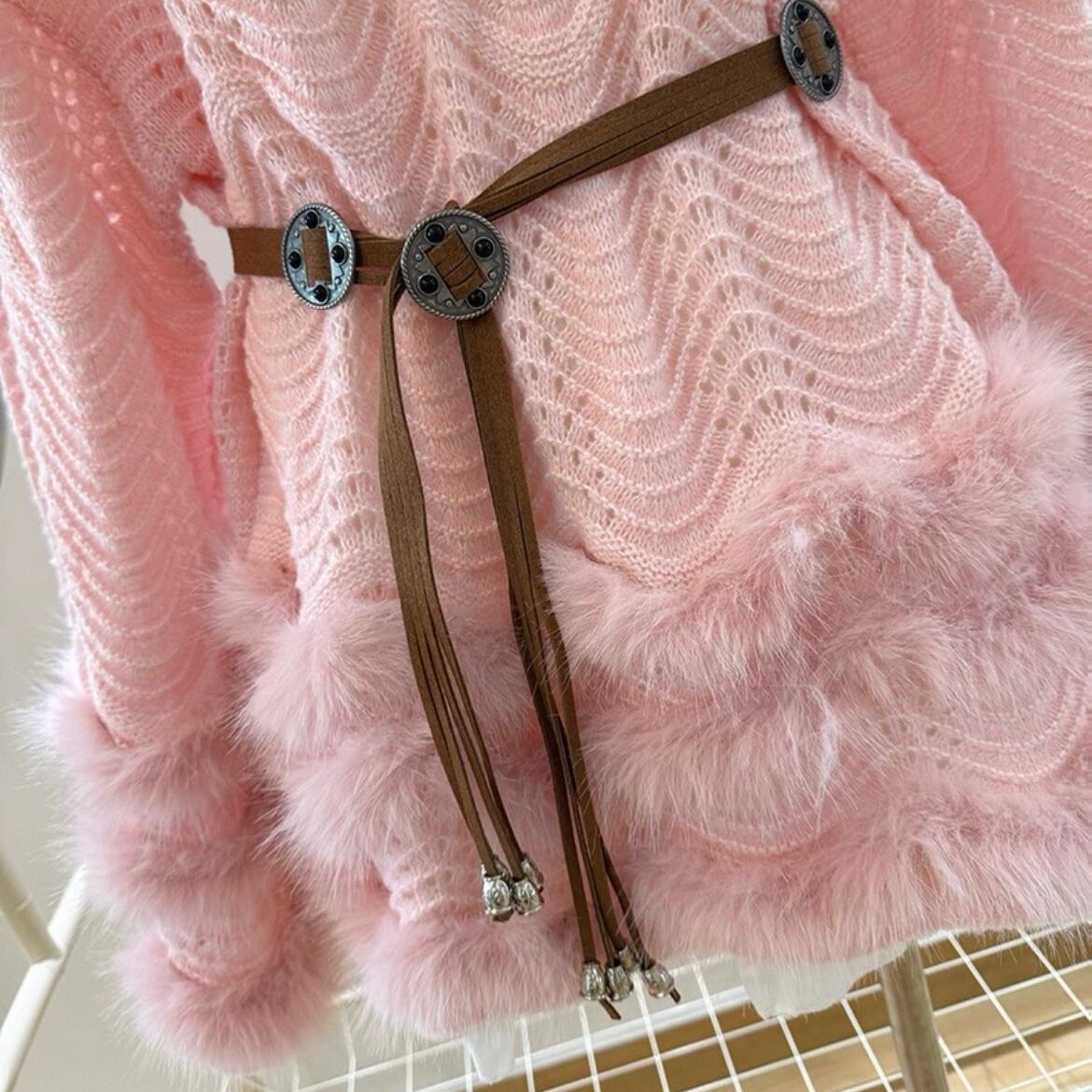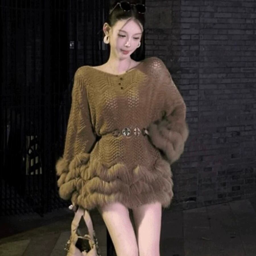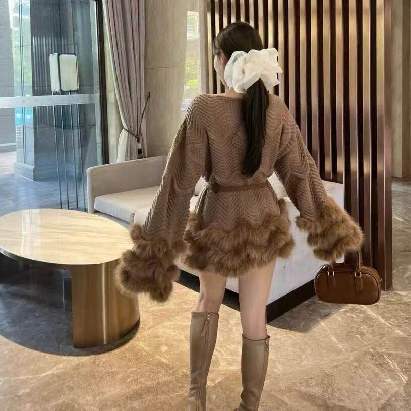 [秋冬♡][ベルトセット♡] Ladies / S〜2XL・3色展開 / ファー × ニット ベルトセット ミニワンピース ⭐︎+°303
