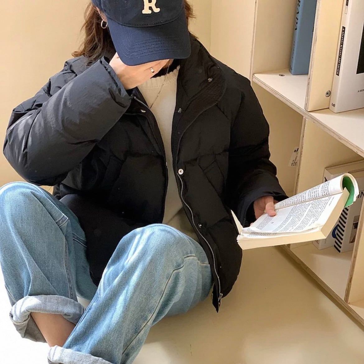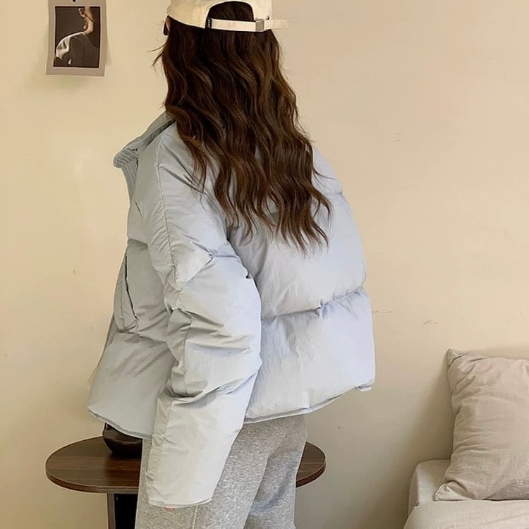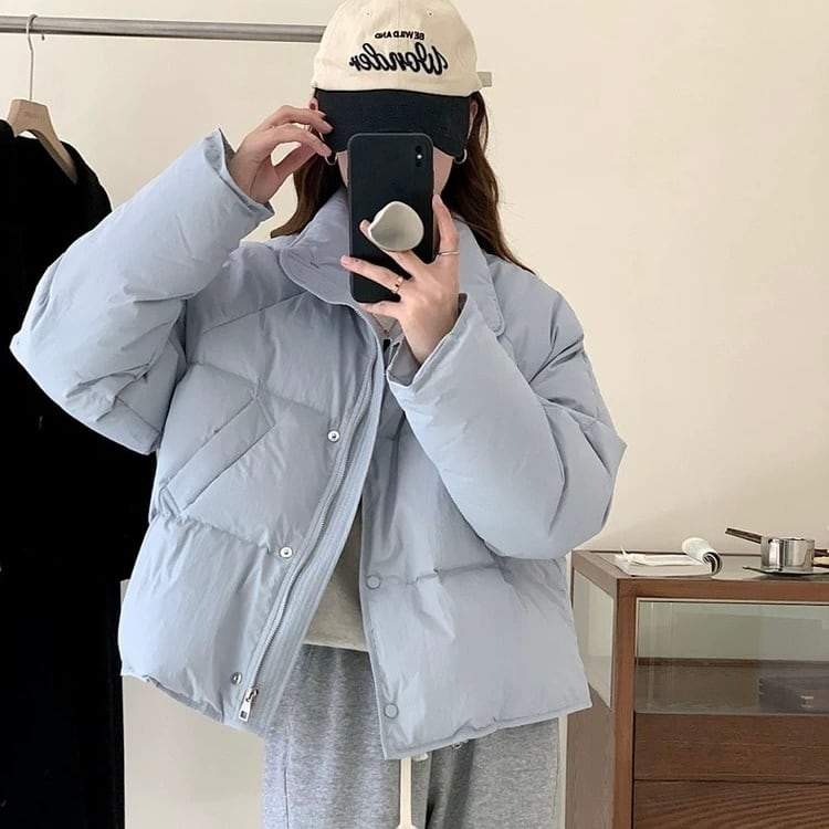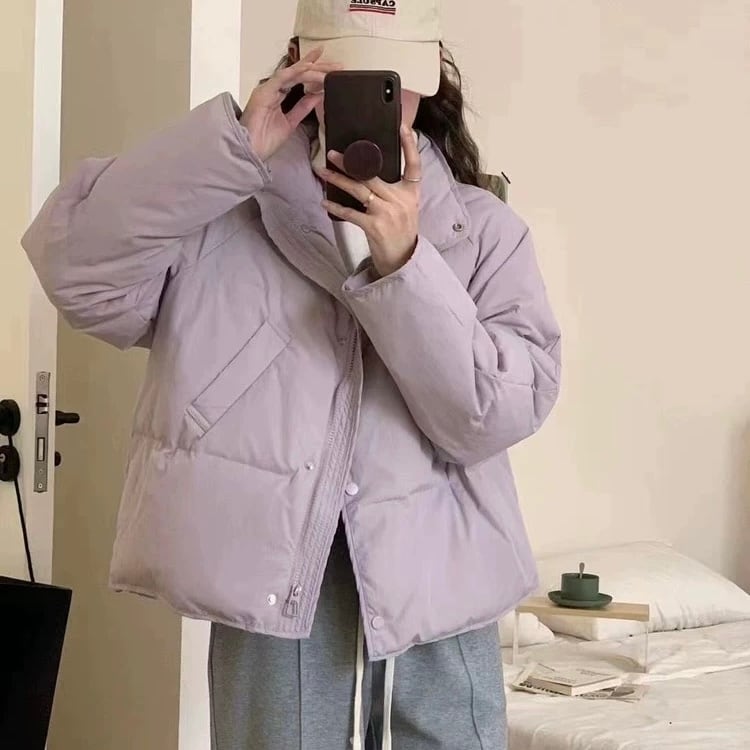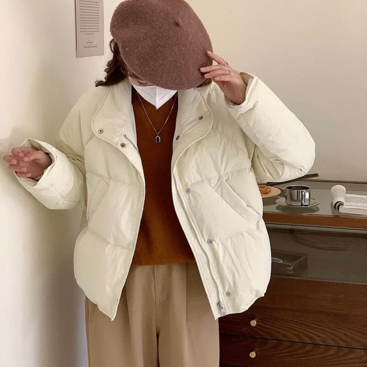 韓国っぽいくすみカラーが可愛いシンプルな中綿ダウンアウターはどんなコーデにもマッチ♡ゆとりがあるから真冬のニットの上からも着膨れせず着用できそう。