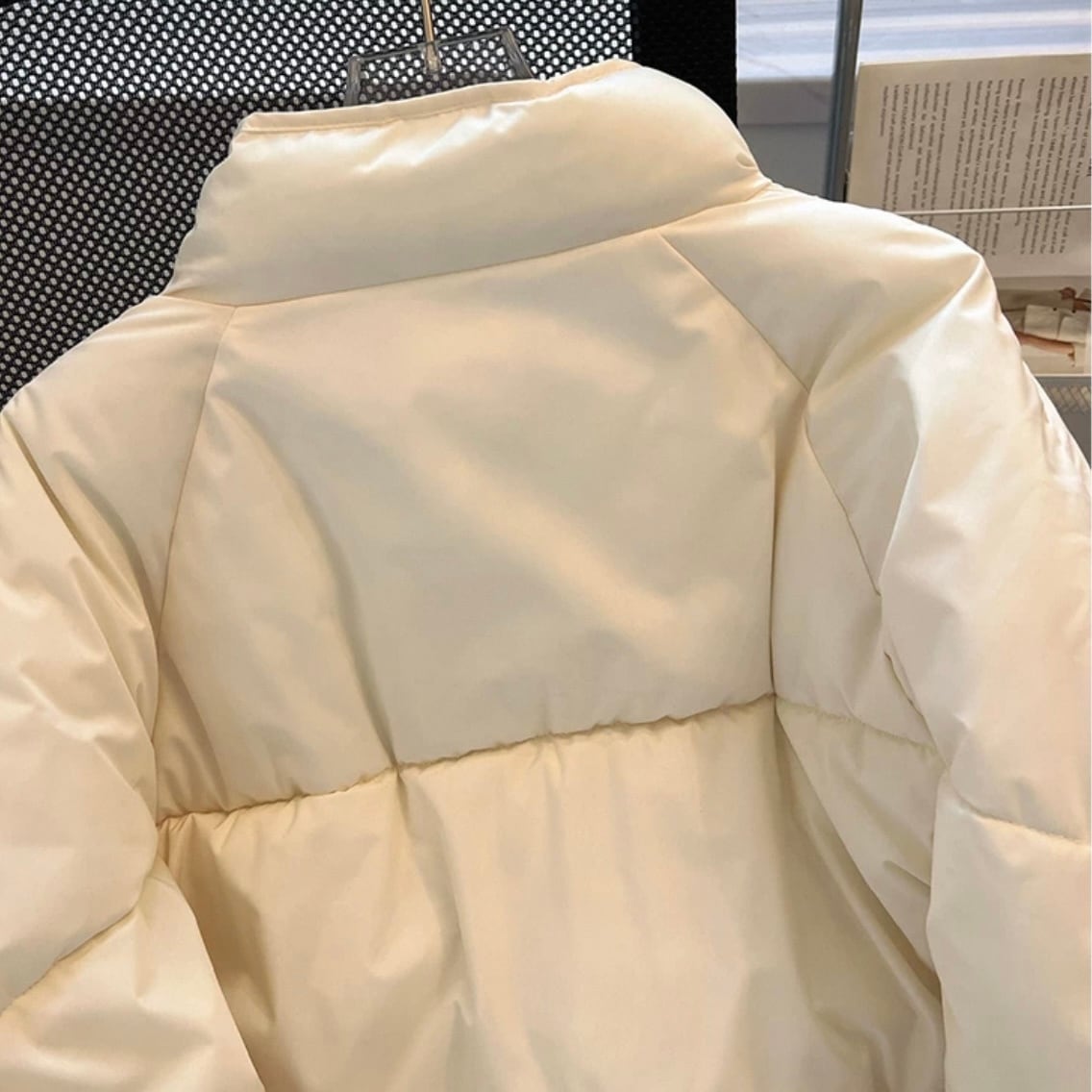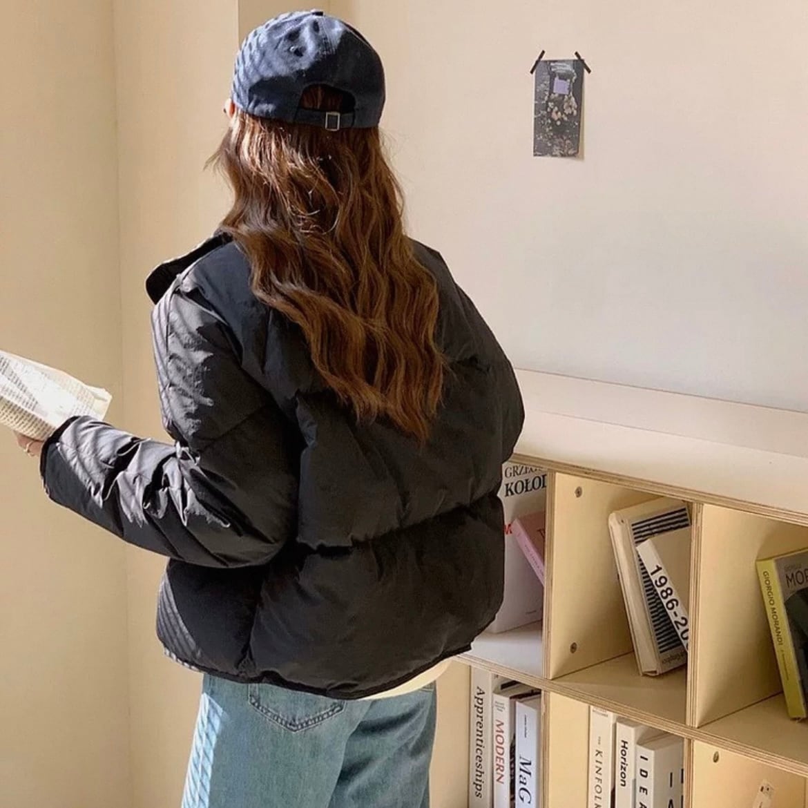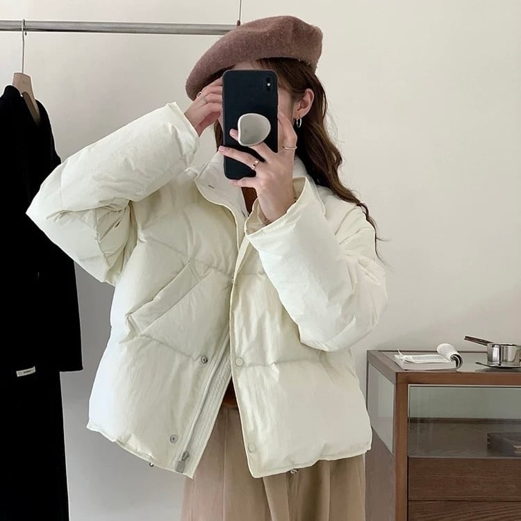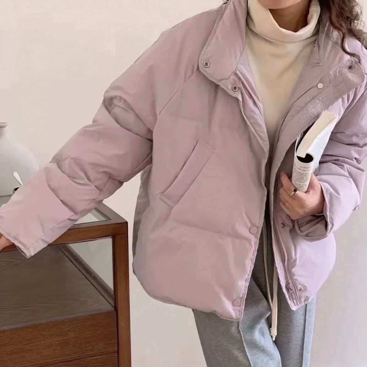 韓国っぽいくすみカラーが可愛いシンプルな中綿ダウンアウターはどんなコーデにもマッチ♡ゆとりがあるから真冬のニットの上からも着膨れせず着用できそう。