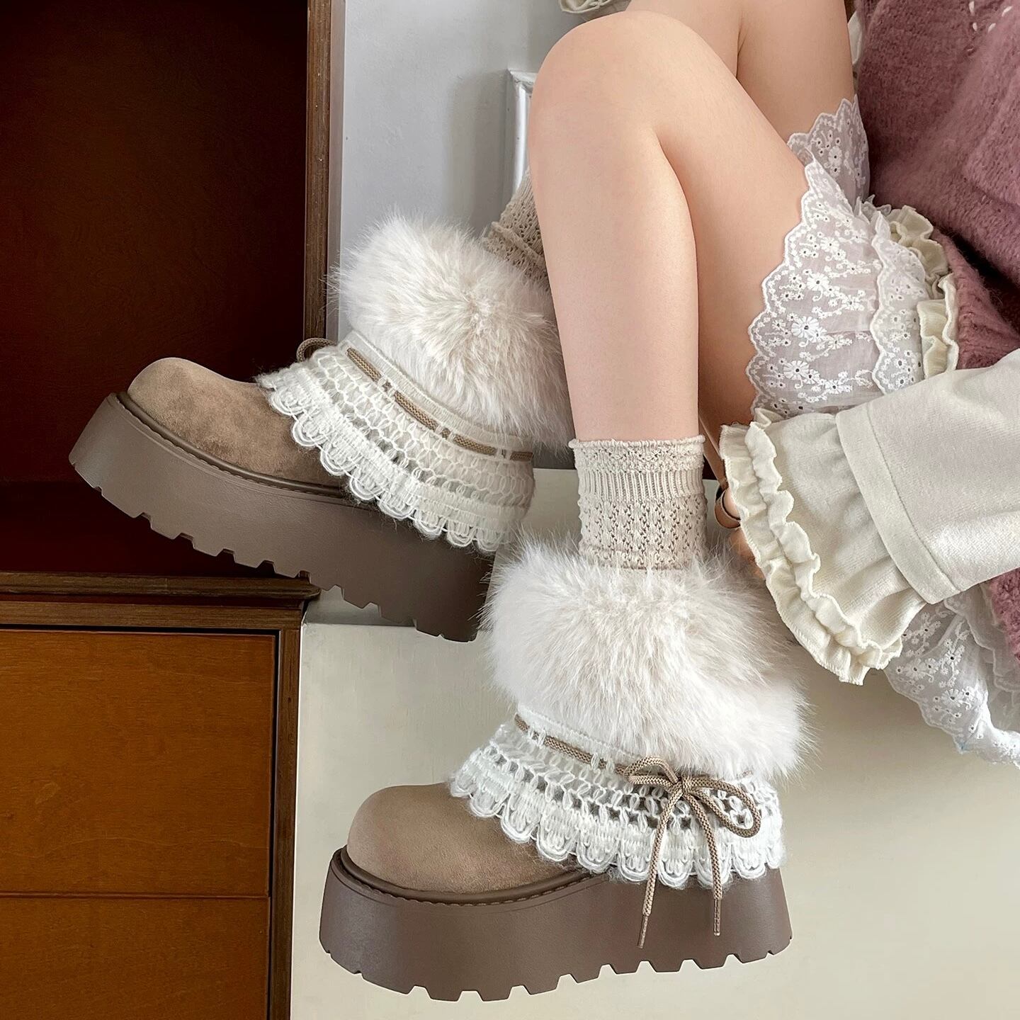 [ファーブーツ♡][コットンレース♡] Ladies / 22.5〜25cm・3色展開 / フェイクファー×コットンレース 厚底ムートンブーツ ⭐︎+°157