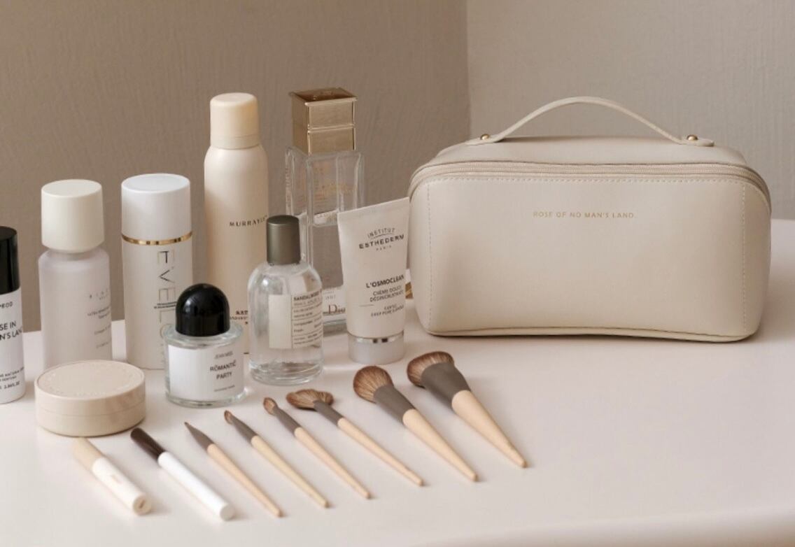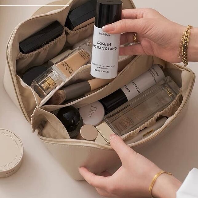 持ち運びにうれしい大容量メイクポーチ!旅行にも便利♡メイクだけでなくこまごましたものをまとめたり、そのままおうちでのメイクにも使えて◎