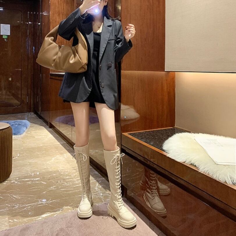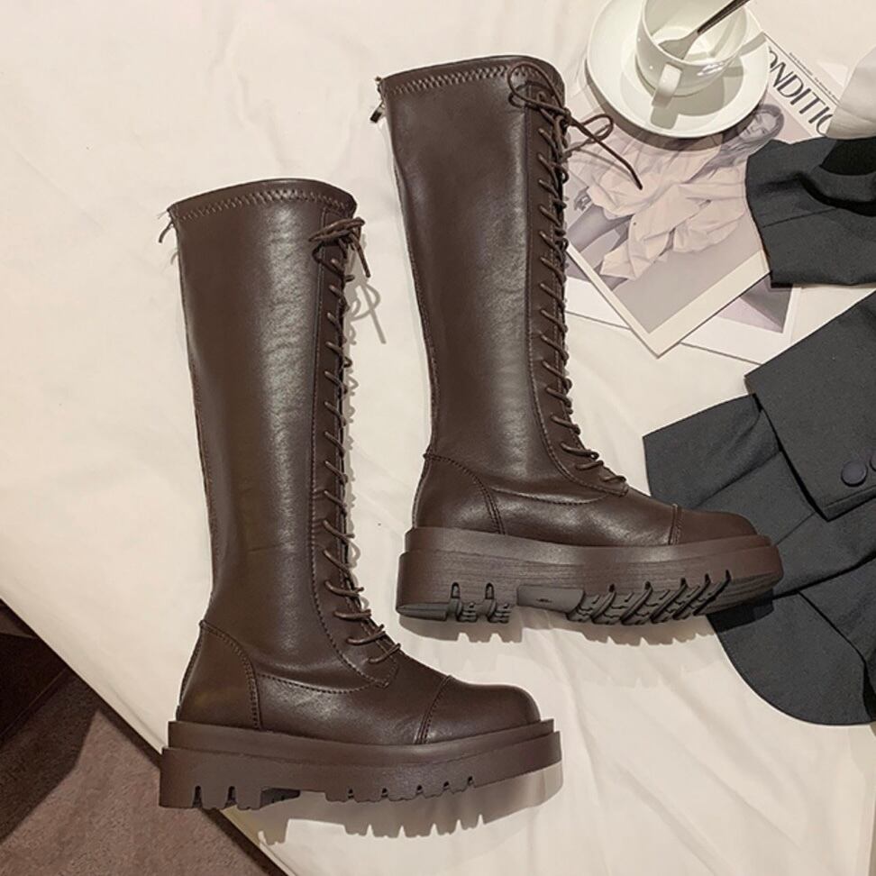 足元をスラっとおしゃれに見せてくれる総レースアップフェイクレザーブーツ。流行りに関係なく、ベーシックにいつまでも愛用できる秋冬必須アイテム。
