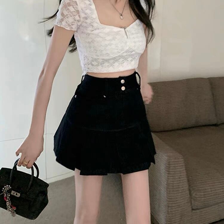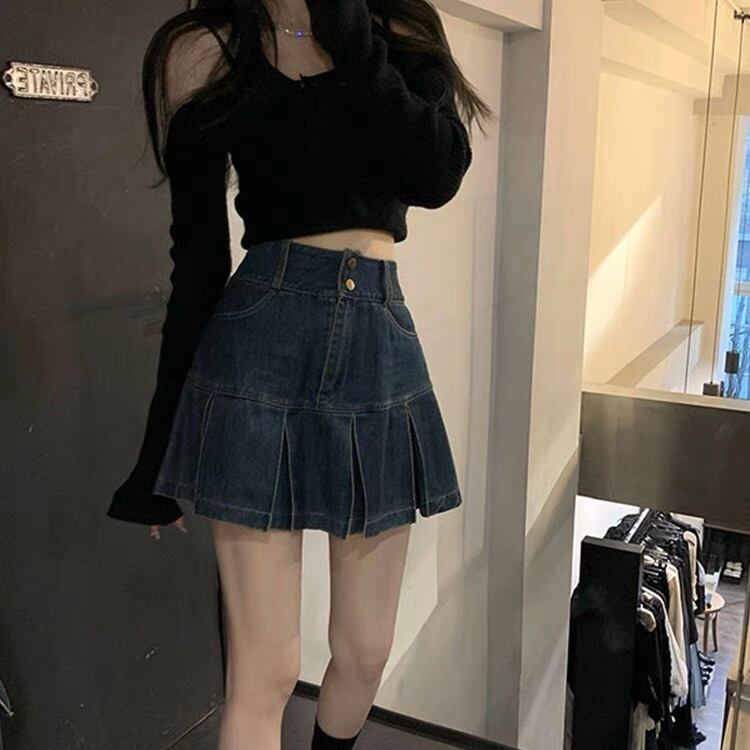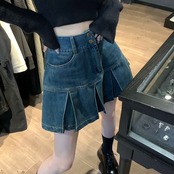 パンツ型で黒のコットン裏地付きで安心のプリーツデニムミニスカート♡ ショート丈トップスやブラウスと合わせて今っぽく♡
