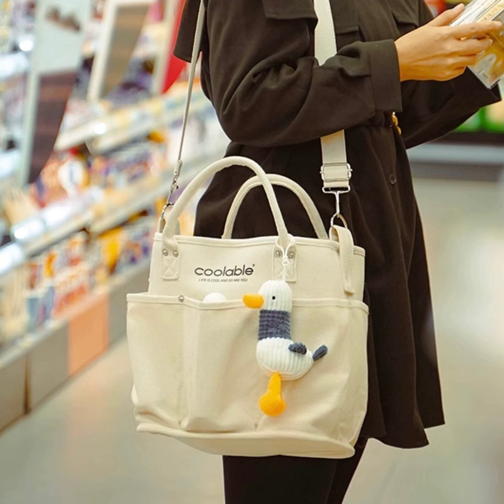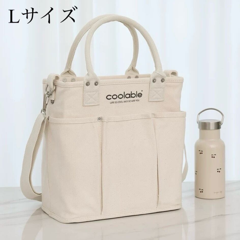 キャンバス生地でしっかり自立する大容量の便利バッグ。お出かけに丁度いいサイズ感ながら、babyグッズの収納も◎ 肩紐付きだからショルダーバッグやベビーカーに装着も◎