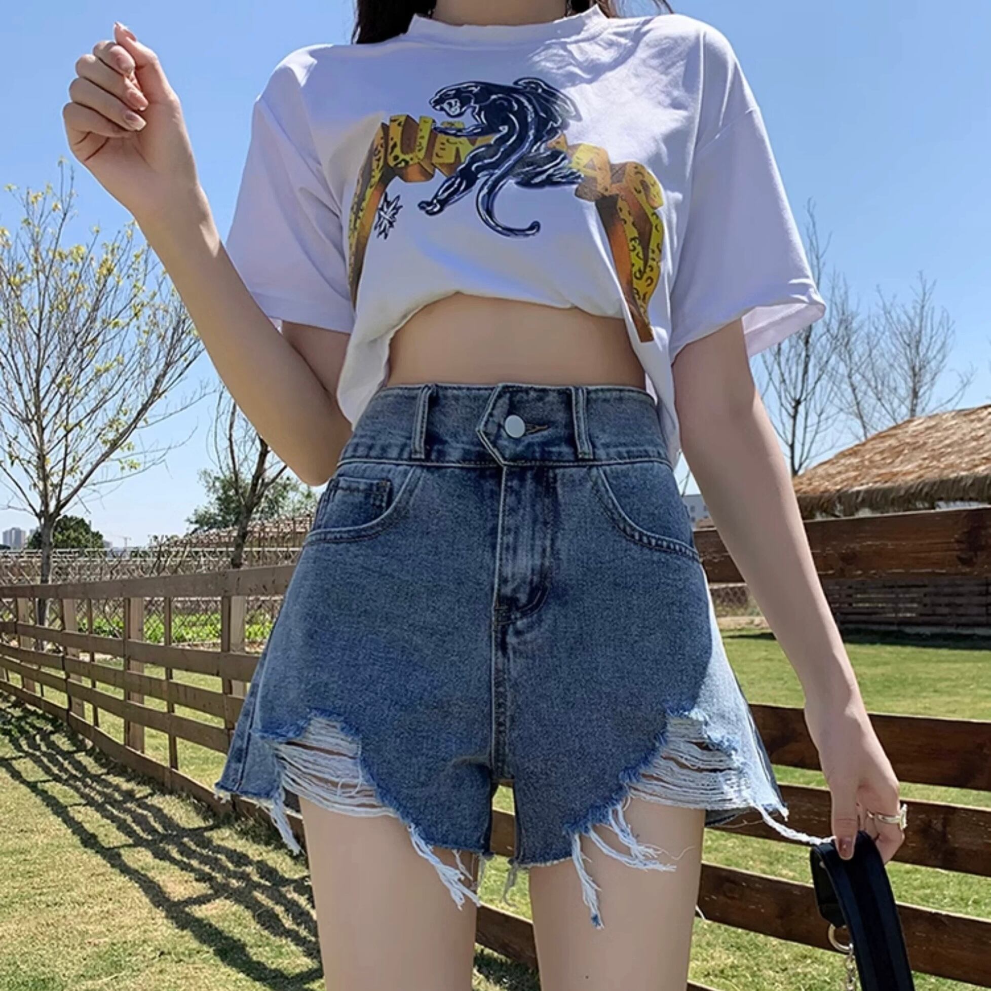 Ladies / XS〜XL・2色展開 / ダメージ カットオフ デニム ラフショートパンツ ⭐︎+°159