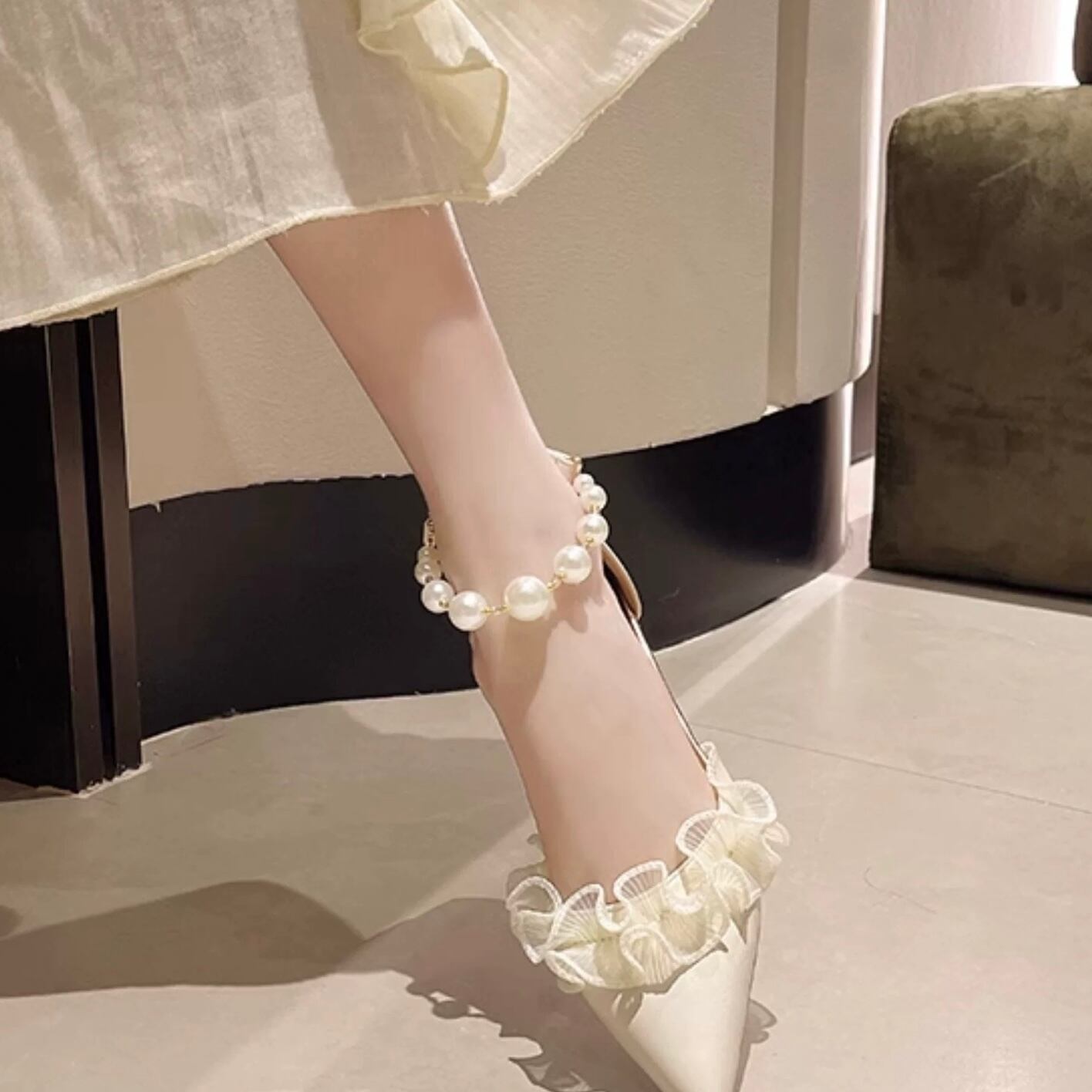 フォーマルな場でも使えるエレガントな印象のフラットパンプス。ビジュー仕様のストラップが◎